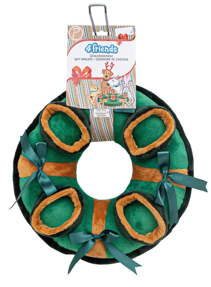 Überraschen Sie Ihren treuen Begleiter mit dem 4Friends Geschenkkranz in lebendigem Grün, dem perfekten Spielzeug für Ihren Hund. Hergestellt aus kuscheligem Plüsch, ist dieser Kranz nicht nur ein Geschenk, sondern eine liebevolle Geste für Ihren vierbeinigen Liebling. In seinen vier Fächern können Sie Leckerlis oder Nassfutterdosen mit einem Durchmesser von 7,5 cm platzieren, um Ihren Hund zu belohnen. Nachdem die Schleifen entfernt wurden, verwandelt sich der Kranz in ein aufregendes Apportierspielzeug oder einen Frisbee für gemeinsame Abenteuer. Die Zertifizierungen nach OEKO-TEX® und CE stellen sicher, dass dieses Spielzeug höchsten Qualitäts- und Sicherheitsstandards entspricht. Trotzdem ist es wichtig, Ihr Haustier während des Spielens zu beaufsichtigen, da keine Spielzeuge unzerstörbar sind. Zeigen Sie Ihrem treuen Gefährten Ihre Liebe und Zuneigung mit dem Geschenkkranz. Eine grossartige Geschenkidee, die Ihr Hund sicherlich lieben wird.