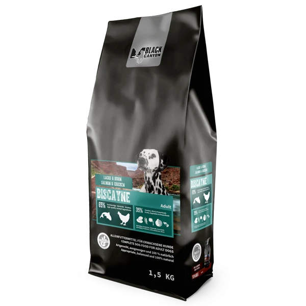 BLACK CANYON Biscayne – Lachs & Huhn ist ein Alleinfuttermittel für ausgewachsene Hunde und besteht aus frischem Lachs und magerem Hühnerfleisch, die Ihrem Vierbeiner zwei erstklassige Proteinquellen liefern. So unterstützen Sie die Muskulatur und die Verdauung Ihres Vierbeiners optimal. Darüber hinaus enthält dieses Futter wertvolle Omega-3- und Omega-6-Fettsäuren aus Lachs und Leinsamen, die für eine gesunde Haut und ein glänzendes Fell sorgen. Natürliche Pflanzenextrakte wie Hagebutte, Granatapfel und Mariendistel stärken das Immunsystem, haben entzündungshemmende Eigenschaften und schützen die Leber. Mit dieser Hundenahrung verwöhnen Sie Ihren besten Freund nicht nur mit einem köstlichen Geschmack, sondern auch mit einer ausgewogenen Ernährung.