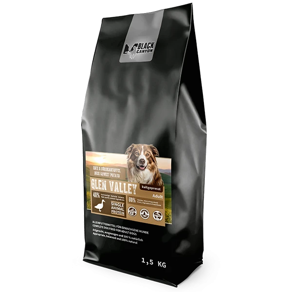 BLACK CANYON Glen Valley Adult – Ente & Süsskartoffel bietet Ihrem Hund eine artgerechte und naturnahe Ernährung, die sich an seinen Bedürfnissen orientiert. Das Entenfleisch liefert wertvolle Proteine für eine kräftige Muskulatur. Kartoffeln und Süsskartoffeln liefern Energie und Ballaststoffe für eine gute Verdauung. Die Kräuter ergänzen die Rezeptur mit wichtigen Vitaminen und Mineralstoffen, die das Immunsystem stärken.
