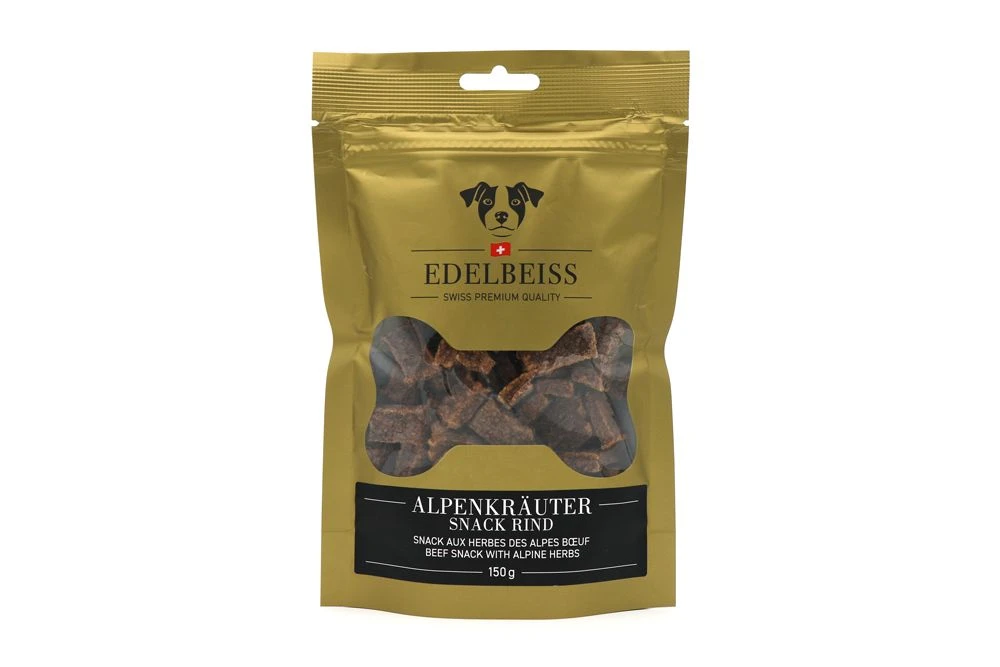 Eine besonders heimatliche Verführung für Ihren Hund! Der Edelbeiss Alpenkräuter Snack bietet Ihrem vierbeinigen Liebling eine einzigartige Fusion aus erstklassigem Schweizer Rindfleisch und feinsten Alpenkräutern, die ebenfalls aus der Schweiz stammen. Diese exquisite Mischung vereint die herzhafte Qualität des Fleisches mit den aromatischen Nuancen der Alpenkräuter – ein wahres Geschmackserlebnis im handlichen Snack-Format. Gönnen Sie Ihrem Hund diese delikate Kombination, die ideale Wahl für anspruchsvolle Fellnasen.