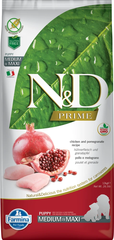 Farmina N&D Prime Puppy Huhn Medium / Maxi ist ein hochwertiges Futter, das speziell für Welpen, trächtige und säugende Hunde entwickelt wurde. Es enthält frisches Hühnerfleisch, Hering und Eier als Hauptproteinquellen mit einem optimalen biologischen Wert. Das bedeutet, dass Ihr treuer Begleiter die Proteine leicht verdauen und verwerten kann. Ausserdem sorgen sie für eine kräftige Muskulatur und ein glänzendes Fell. Das Futter ist reich an Vitaminen und Mineralstoffen aus frischem Obst und Gemüse wie Granatapfel, Apfel, Süssorange und Heidelbeere. Diese unterstützen das Immunsystem, die Augen und die Haut Ihres Vierbeiners.