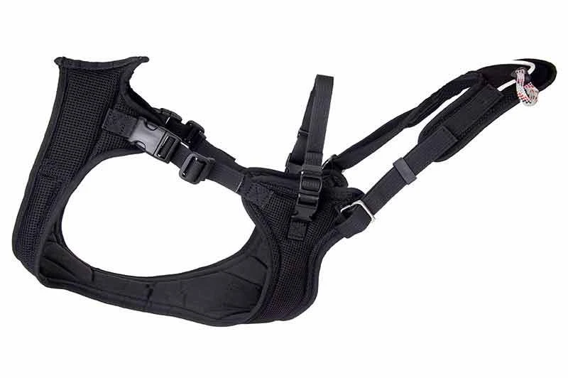 Der einzige Gurt, der quer über den Rücken verläuft, dient nur zur Stabilisierung des Geschirrs, wenn kein Zug auf der Leine ist. Er liegt locker auf dem Rücken des Hundes und hat während des Ziehens keine Funktion – je nach Körperform des Hundes ist dieser Gurt überflüssig.