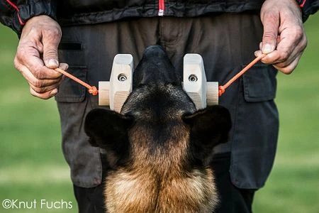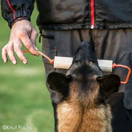 Mit Hilfe eines Imbuss-Schlüssels können die Seitenteile so verschoben werden werden, dass ihr Hund es nur im vorderen Bereich des Mauls nehmen kann. Das Holz drückt beim unruhigen Halten am breiter werdenden Fang. Ein ruhiger, fester Griff ist also angenehmer.