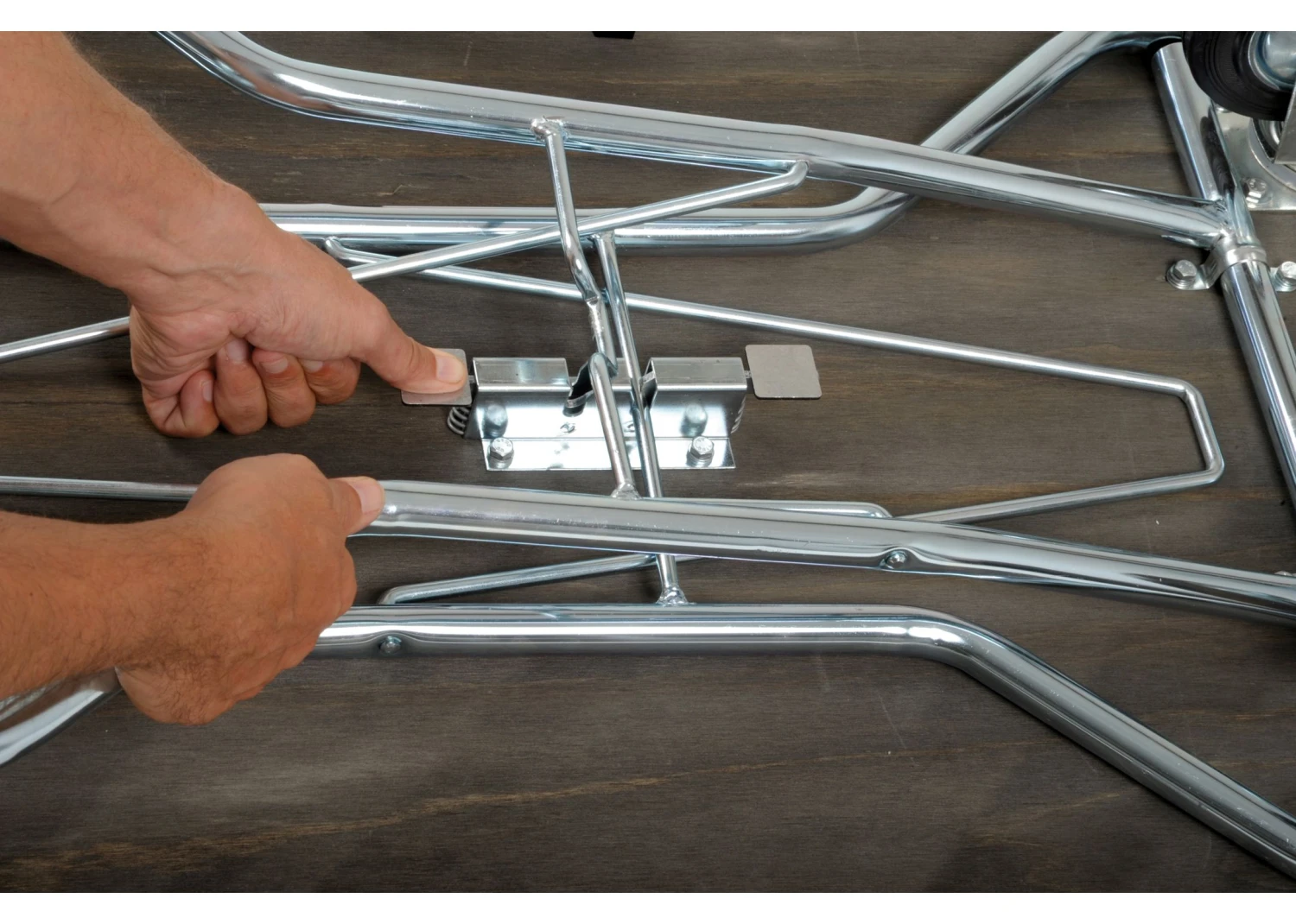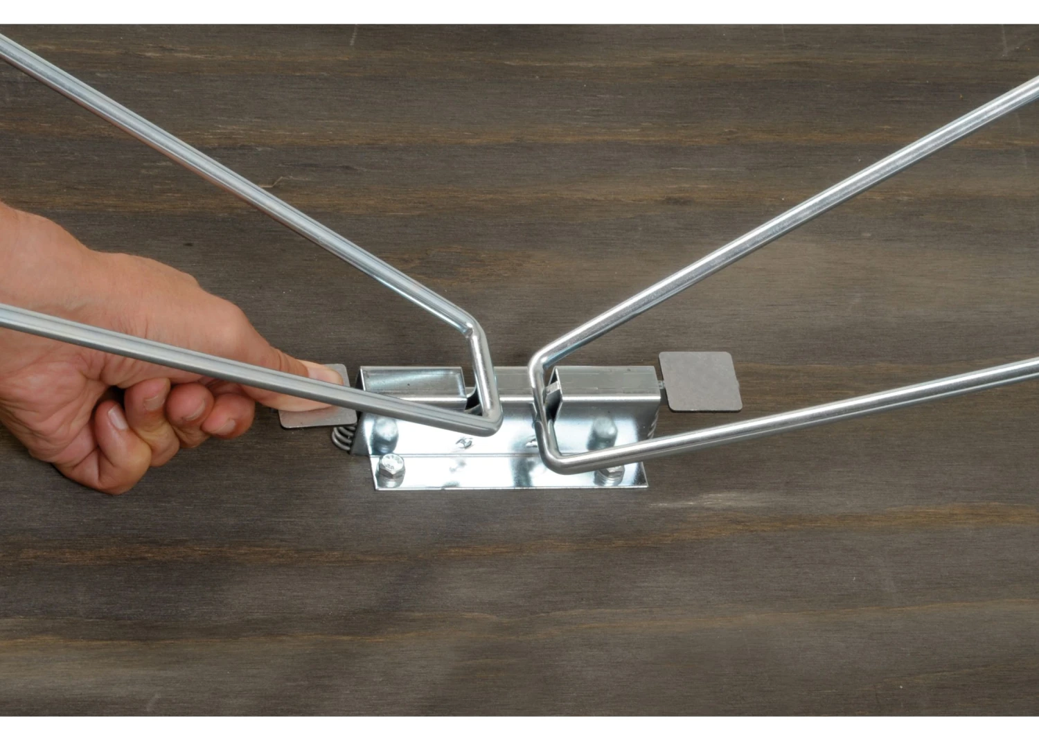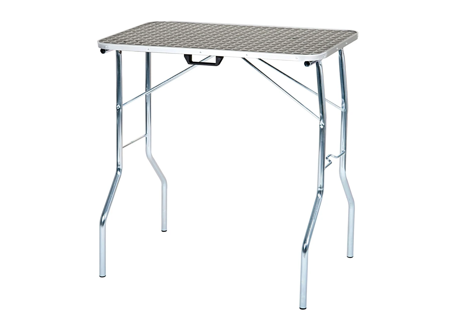 Tragbarer Trimmtisch aus Qualitätsholzplatten mit verchromten Stahlbeinen. Leicht aufzustellen und zusammenzuklappen dank des „Klick“-Systems zur Arretierung der Beine. Dieser robuste Tisch hat eine schwarze Gummiplatte mit einer eloxierten Aluminiumverkleidung.